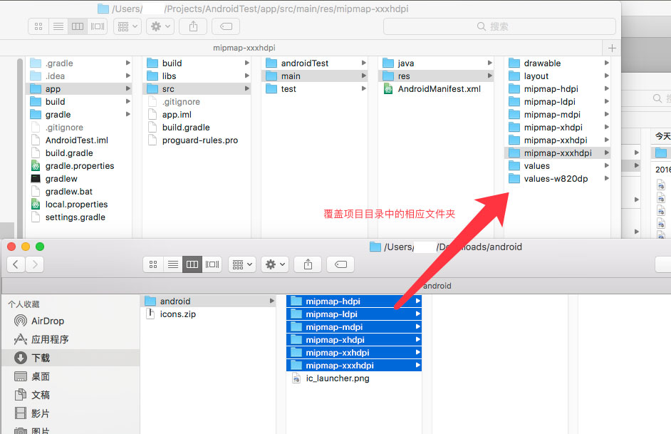 覆盖项目目录下 app/src/main/res 中的相应文件夹。你也可以在 Android Studio 中覆盖这个文件。